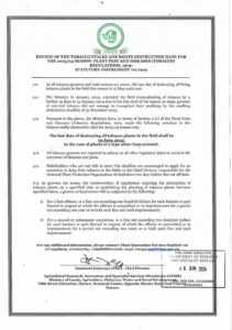 The Ministry of Lands, Agriculture, Fisheries, Water and Rural Development under the Department of Research and Specialist Services, sends out annual reminders to all tobacco producers in Zimbabwe to destroy their tobacco stalks before the mandated date of May 15 of each season. This is essential for disease control. The deadline has been extended to…