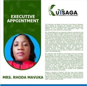 The Chairman and Board of Directors of the Tobacco Research Board (trading as Kutsaga) are delighted to announce the appointment of Mrs. Rhoda Mavuka as the inaugural Executive Director of the Productionand Operations sector. This appointment is with effect from 02 April 2024. Mrs. Rhoda Mavuka is an experienced tobacco scientist who has worked at…
